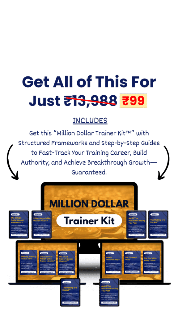 The price for “The Million Dollar Trainer Kit” is normally ₹9,989… BUT as part of a pre-launch campaign to gather powerful success stories, I’m offering it for just ₹99. This special price won’t last long, so grab it now!